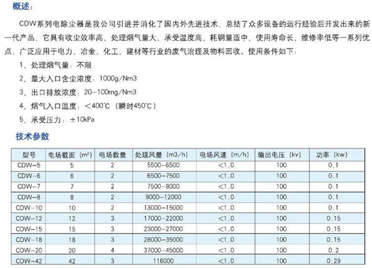 CDW系列電除塵器是我公司引進(jìn)并消化了國內(nèi)外先進(jìn)技術(shù),總結(jié)了眾多設(shè)備的運(yùn)行經(jīng)驗后開發(fā)出來的新一代產(chǎn)品,它具有收塵效率高、處理煙氣量大、承受溫度高、耗鋼量適中、使用壽命長、維修率低等一系列優(yōu)點(diǎn),廣泛應(yīng)用于電力、冶金、化工、建材等行業(yè)的廢氣治理及物料回收。使用條件如下.1、處理煙氣量:不限;2、最大入口含塵濃度:1000g/Nm3;3、出口排放濃度:20-100mg/Nm3;4、煙氣入口溫度:<400C(瞬時450C);5、承受壓力:土10kPa。